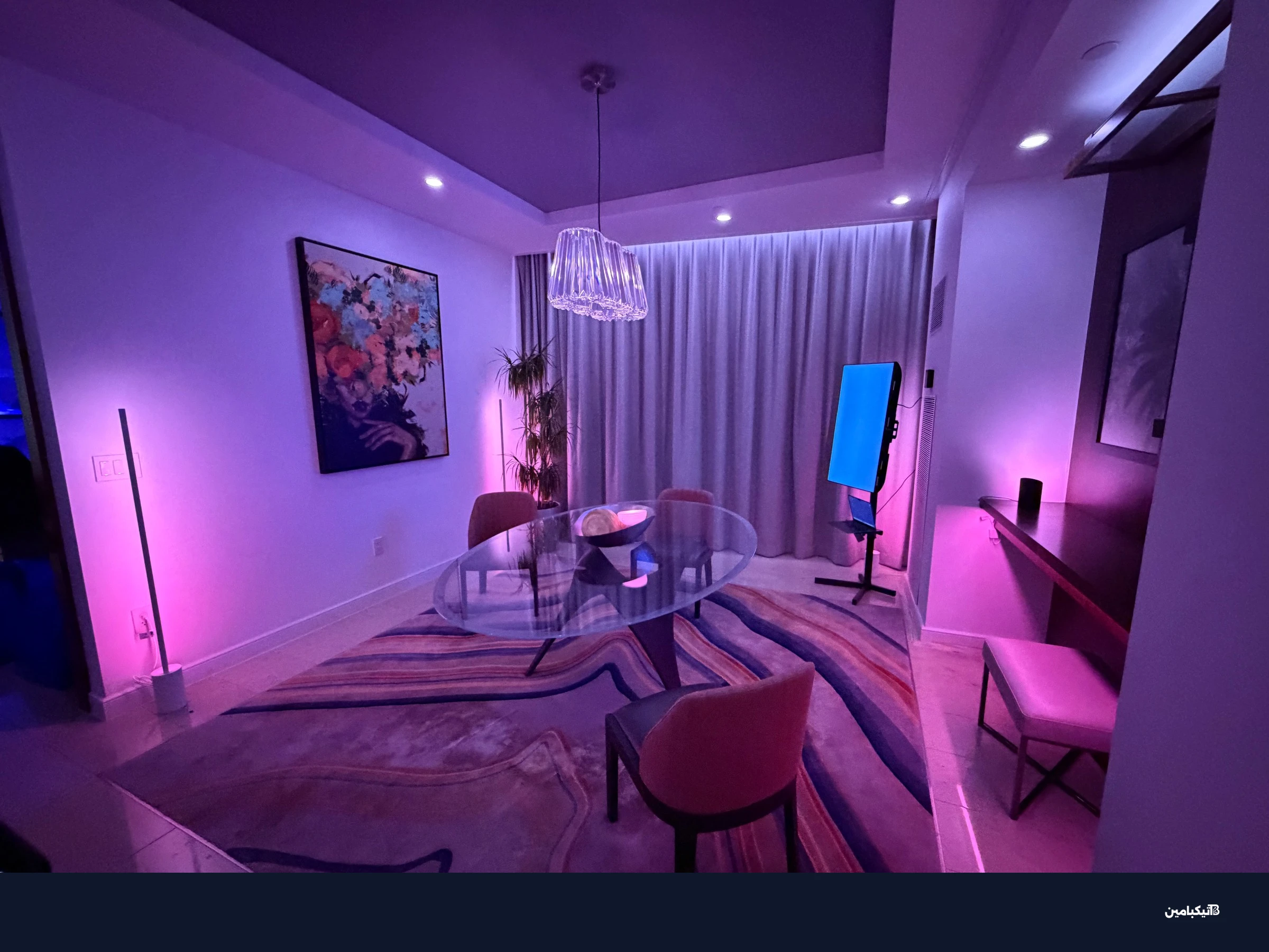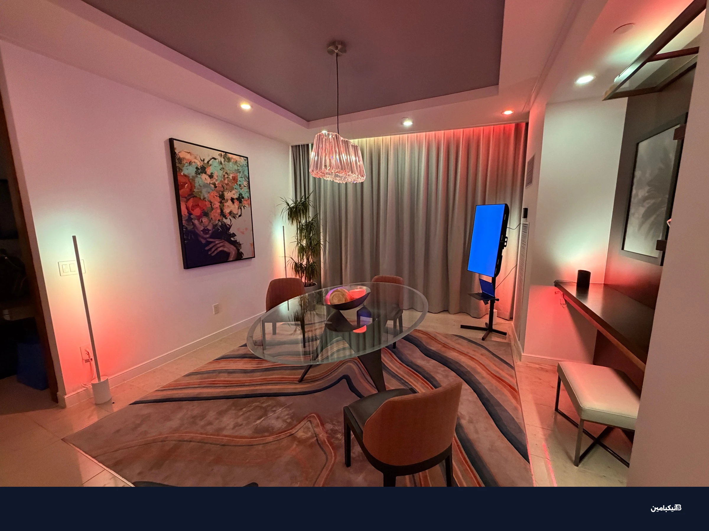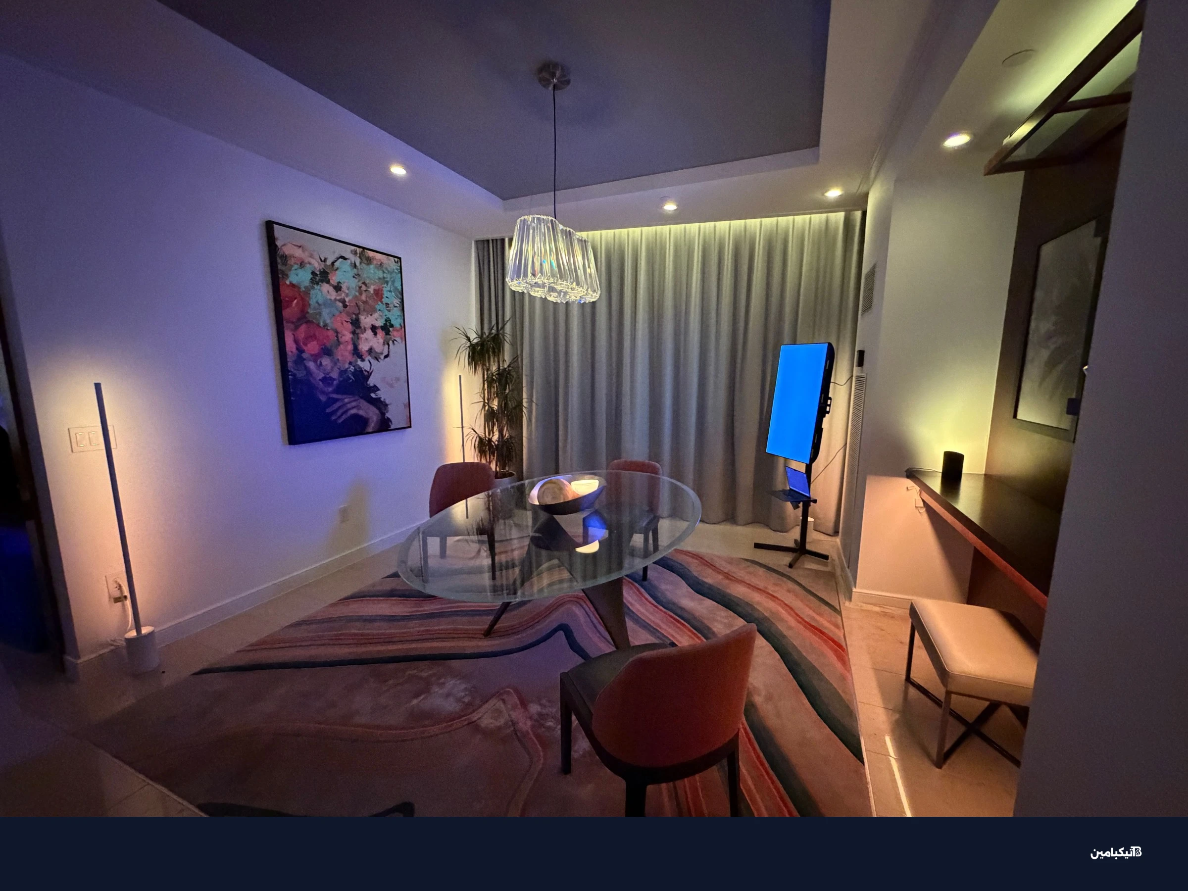 في مشهد الغروب على سبيل المثال، ستظهر المصابيح الجانبية في جانب واحد من الغرفة درجات أصفر دافئة لمحاكاة غروب الشمس، بينما ستظهر الإضاءة السقفية في الجانب الآخر درجات أغمق وألواناً مختلفة.